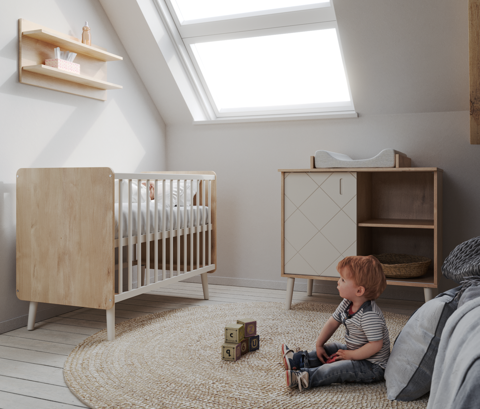 Kjer nežnost sreča eleganco. Svetla bela sobica z drobnimi detajli, ki prinašajo občutek miru, varnosti in domačnosti. Popolno okolje za prve sanje, prve korake in tisoč nasmehov.