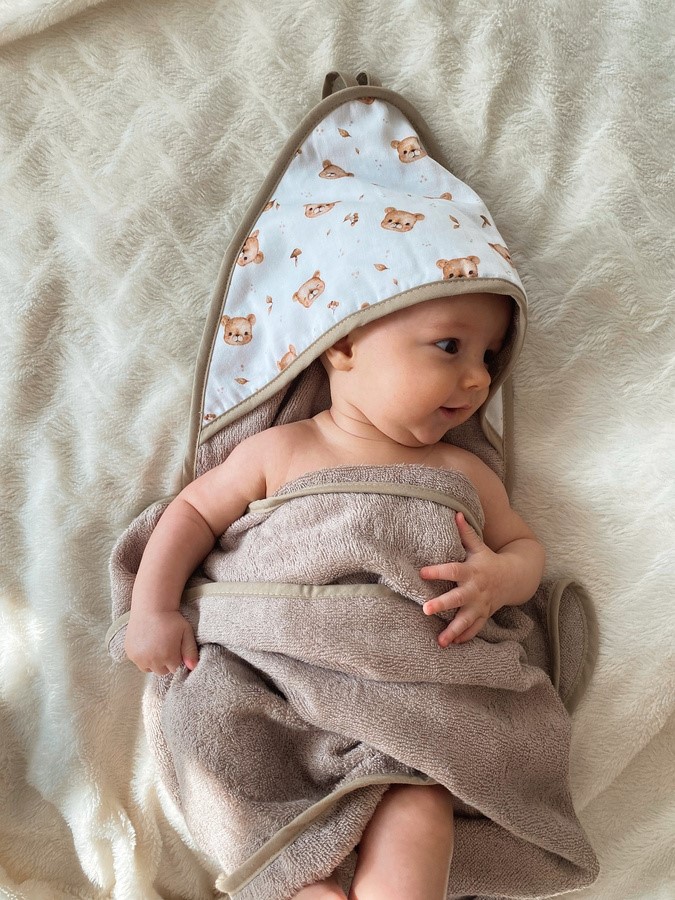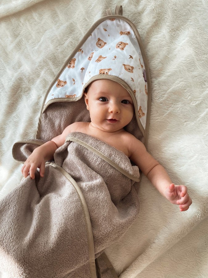 kapuca, ki prekriva glavo, odlično vpija vodo in temeljito posuši občutljivo otroško kožo,